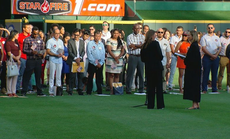 One-hundred-fourteen people swore the oath to become American citizens in front of the crowd at Great American Ball Park.