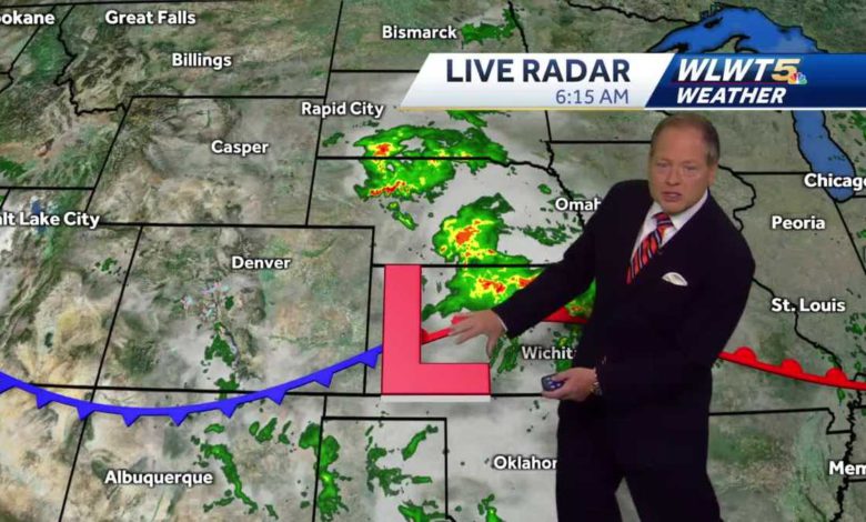 MAY -- 82, 84 -- THOSE NUMBERS ARE ON THE WAY FOR THE WEEKEND. A FAR CRY FROM 45 DEGREES, THE LOW YESTERDAY MORNING SATURDAY. AVERAGE HIGH THIS TIME OF THE YEAR IS 74. WE WILL NOT BE ALL THAT FAR AWAY FROM THAT. I THINK WE TOP AT AROUND 71. LIGHT SHOWERS AND SPANGLE SHOWING UP ON LIVE WLWT RADAR. YOU CAN SEE ONE TINY AREA HERE OVER PARTS OF SOUTHEAST INDIANA. OLDENBURG, A VERY BRIEF SHOWER THERE. A BRIEF SHOWER SOUTH OF 74 IN RIPLEY COUNTY. THAT IS ALL WE HAV IN RIPLEY COUNTY AND NORTHERN DEARBORN COUNTY. ALSO A COUPLE OF SHOWERS OVER SOUTHERN BUTLER COUNTY, NORTHERN HAMILTON, SOUTHERN WARREN COUNTY. THAT IS IT. THE MAIN WEATHER MAKER THAT WILL BRING RAIN, SHOWERS AND THUNDERSTORMS FOR THE START OF THE WORK WEEK, IS STILL WAY BACK TO THE WEST, ALTHOUGH IT IS FINALLY STARTING TO MOVE, NOW BEGINNING TO EDGE INTO WESTERN KANSAS. THIS AREA OF SHOWERS AND THUNDERSTORMS, WE WILL AGAIN TO SEE THAT HEADING THROUGH THE DAY MONDAY. SO AN UMBRELLA FOR THE START OF THE WORK WEEK. YOU WILL NEED THAT TO BE ON THE SAFE SIDE. AND IT WILL SOON FEEL NOT JUST LIKE SPRING BUT LIKE SUMMER. BY THE SECOND HALF OF THE WEEK, TEMPERATURES IN THE LOW TO MID 80’S THURSDAY, FRIDAY, AND SATURDAY. TAKE A LOOK NOW AS WE HEAD OUTSIDE. CLOUDY SKIES THERE OVER THE QUEEN CITY. NOT LOOKING AT ANYTHING IN THE WAY OF SUNSHINE THIS MORNING, ALTHOUGH I DO HAVE A LITTLE SUNSHINE FOR THIS AFTERNOON. AND THAT IS A BIT OF AN OPTIMISTIC CHANGE FROM YESTERDAY’S FORECAST. 57 AT THE INTERNATIONAL AIRPORT. THERE BREEZE NOW TO THE WEST AND SOUTHWEST AT 5 MILES PER HOUR. PRETTY MUCH EVERYBODY BACK TO ALL NUMBERS IN THE 50’S ACROSS THE ENTIRE TRI-STATE AREA. MAYSVILLE AT 54 DEGREES. FUTURECAST SHOWS CLOUDY SKIES THIS MORNING, BUT NOTICE AS WE GET INTO THE AFTERNOON, WE WILL BEGIN TO SEE A COUPLE PEAKS OF SUNSHINE. THAT WILL BE AWFULLY NICE, ESPECIALLY FOR THE BIG OPENING OF THE STADIUM THERE, TQL STADIUM ON THE WEST END, THE BIG SOCCER HOME OPENER. OTHERWISE, SHOWERS AND THUNDERSTORMS STARTING TO COME IN, AND IT LOOKS LIKE THE MORNING COMMUTE MONDAY WILL BE A WET ONE, SO PLAN ACCORDINGLY FOR THAT. HERE IS A LOOK AT YOUR FORECAST TODAY. WE TOP OUT AT 71 DEGREES. CLOUDS THIS MORNING, SUNSHINE THIS AFTERNOON. A FEW SPRINKLES BUT A COMFORTABLE DAY ALL AND ALL. TONIGHT, 56. BECOMING CLOUDY WITH SHOWERS LIKELY. THUNDERSTORMS POSSIBLE LATE TONIGHT AND INTO TOMORROW. A WEATHER IMPACT THEY TUESDAY, ALTHOUGH THEY WILL BE MORE SCATTERED. CHECK