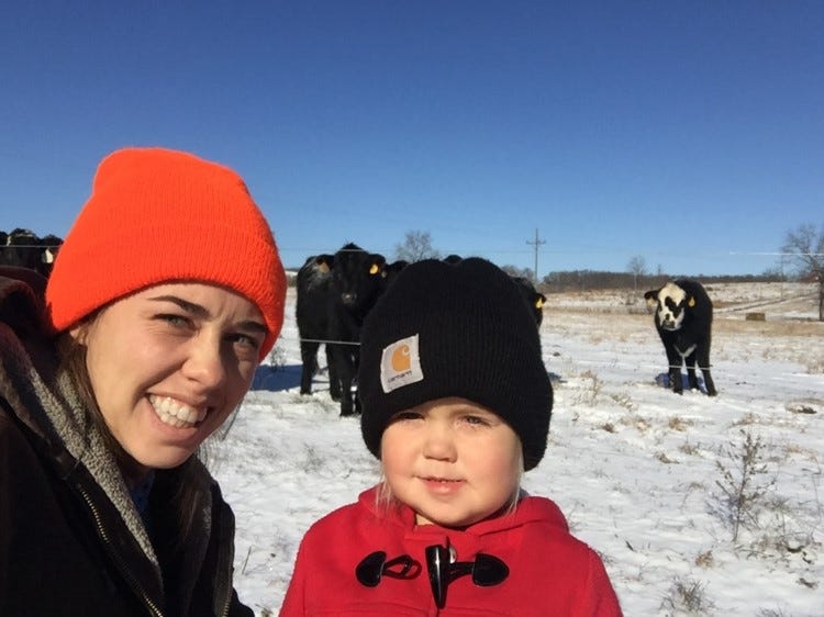Top: Kalena Bruce with husband, Billy and daughter, Willa. Bottom: Kalena and Willa Bruce on the family's farm.
