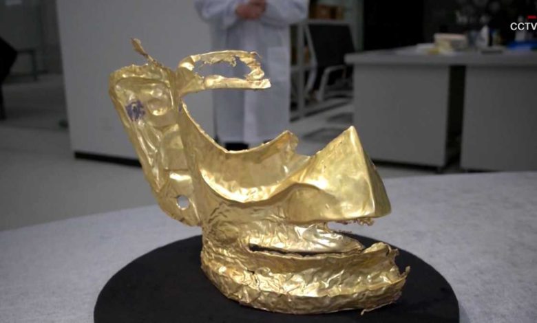 The remains of a gold mask are among a huge cache of 3,000-year-old artifacts found at an archaeological site in China's Sichuan province.