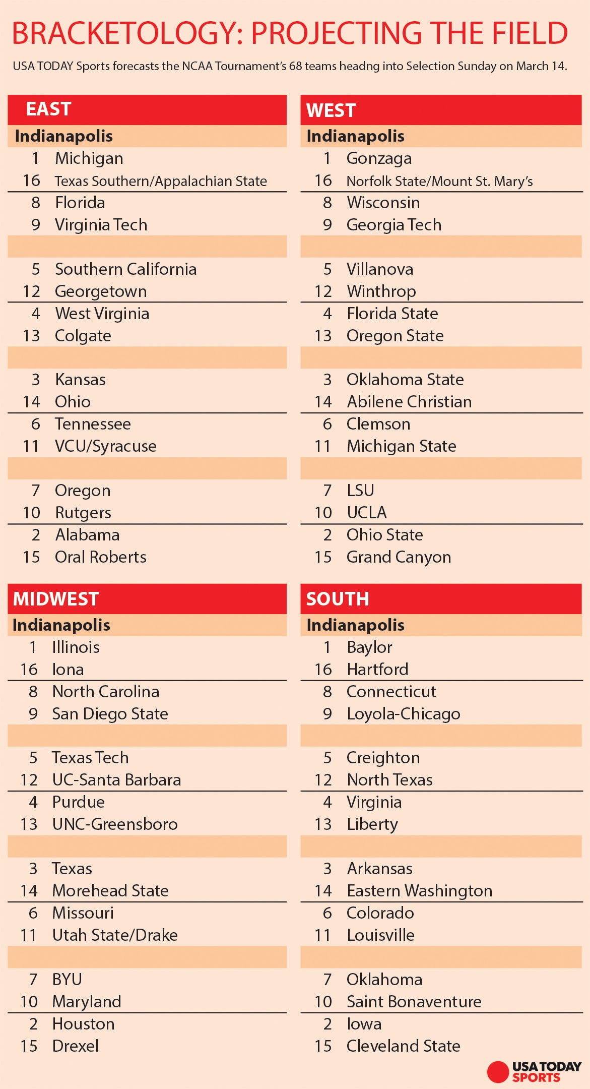 About our bracketologist: Shelby Mast has been projecting the field since 2005 on his website, Bracket W.A.G. He joined USA TODAY in 2014. In his eighth season as our national bracketologist, Mast has finished as one of the top three bracketologists in the past seven March Madnesses. He’s also predicted for The Indianapolis Star, collegeinsider.com and is an inaugural member of the Super 10 Selection Committee. Follow him on Twitter @BracketWag.