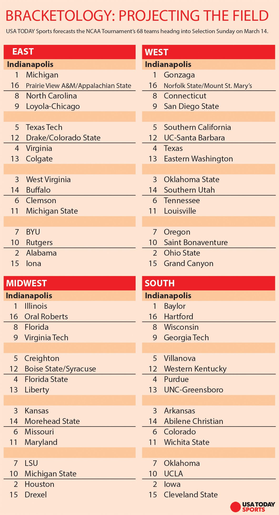 About our bracketologist: Shelby Mast has been projecting the field since 2005 on his website, Bracket W.A.G. He joined USA TODAY in 2014. In his eighth season as our national bracketologist, Mast has finished as one of the top three bracketologists in the past seven March Madnesses. He’s also predicted for The Indianapolis Star, collegeinsider.com and is an inaugural member of the Super 10 Selection Committee. Follow him on Twitter @BracketWag.