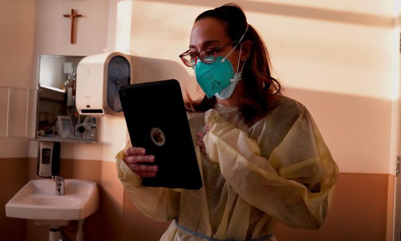 Kilani pulls out her iPad to ring family members. The patient’s wife had an anxiety attack during the last video call, so her adult daughter answers.