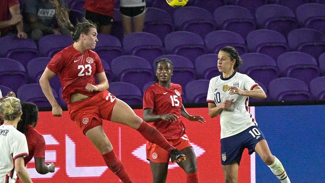 Canada defender Vanessa Gilles (23) heads the ball in front of forward Nichelle Prince (15) and United States forward Carli Lloyd (10) during the first half of a SheBelieves Cup women's soccer match, Thursday, Feb. 18, 2021, in Orlando, Fla. (AP Photo/Phelan M. Ebenhack)