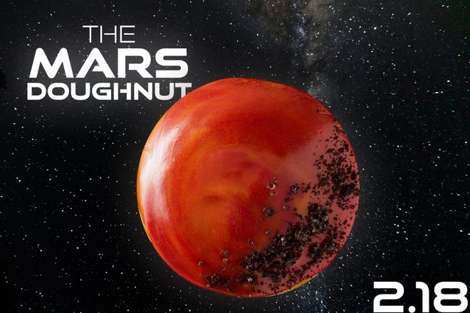 The Mars Doughnut looks like the red planet and will only be available Thursday, while supplies last. It's filled with chocolate creme, dipped in caramel icing with a red swirl and has chocolate cookie crumbs on top.