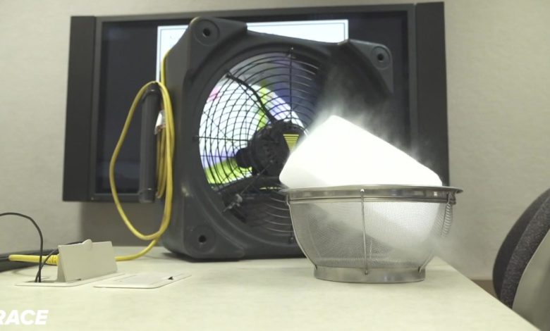 Here’s how their experiment works: the students will get an inquiry from a professor or the university to check a specific classroom or space for airflow. They will set up carbon dioxide monitors, then use dry ice to fill classrooms with carbon dioxide: the same gas we exhale when we breathe. Fans spread it all over the room to simulate a classroom full of students.