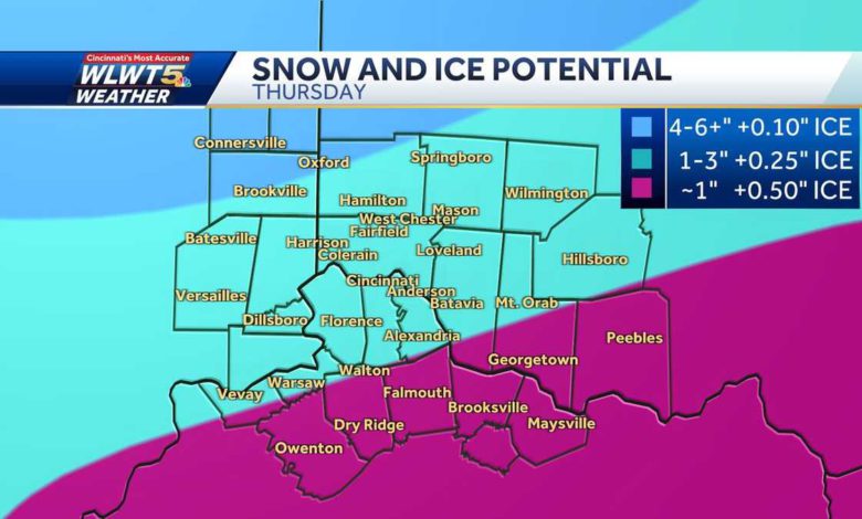 NOW, WLWT NEWS 5 METEOROGILOST ALLISON ROGERS IS HERE. WE GOT THE BARRAGE OF THINGS STARTING WITH RAIN AND NO MOVING TO HEAVIER STUFF. ALLISON: IT IS GOING TO BECOME MORE IMPACTFUL LATE TONIGHT SO IF YOU’RE DRIVING PAST MIDNIGHT YOU WILL NEED TO KEEP THAT IN MIND. I THE TIME WE WAKE UP TOMORROW RNMOING, BIG CHANGES ACROSS CINCINNATI. WE ARE SEEING THE INITIAL ROUND OF THIS WIERNT STORM AS THE FALLING RAIN CONTINUES. YOU CAN SEE IT IS A LITTLE HEAVIEINR INDIANA NORTH OF 74. BROOKVILLE SEEING A LOT OF THAT RAIN AT THE MOMENT TOWARD METAMORA, BLOONGMI GROVE, CONNERSVILLE ALSO SEEING HEAVIER BANDS OF RAIN. OLDENBURG, SAME FOR YOU. WITHIN THE CINCINNATI METRO, WE GOT SPRINKLES AND A RAIN ESPECIALLY ON THE WEST SIDE AND TOWARD DOWNTOWN. MORE SPOTTY RAINFALL HAPPENING FOR AREAS ALONG I-71 CLOSER TO MASON, WESTCHESTER, MIDDLETOWN, HAMILTON AND AREAS SOUTH AND WEST OF THE 275 LOOP CLOSER TO AURORA AND VERILSALES. YOU CAN SEE WHAT IS HEADED OUR WAY. THE WINTRY MIX OF FREEZING RAIN AND SLEET HAPPENING A LITTLE CLOSER TO THE DIINANOLAPIS METRO AND THE SNOW BEHINDHA TT TOURED LAFAYETTE, INDIANA. -- TOWARD LAFAYETTE, INDIANA. WE WILL SEE THE INITIAL ROUND OF FREEZING RAIN MOVING TOIN THE NORTHWESTERN COMMUNITIES, CONNERSVILLE, BROOKSVILLE AND OXFORD. TONIGHT AND EARLY TOMORROW, WE WILL SEE THE LINEF O FREEZING RAIN AND SLEET WORKING FARTHER SOUTH AND EAST. THIS IS 6:00 IN THE MORNING TOMORROW AND WE HAVE ALREADY GOT THE FREEZING RAIN AROUND THE METRO. MUCHF O OUR MAJOR THOROUGHFARES ARE DEALING WITH IT AT THIS POINT AS WELL DAN WE WILL SEE THAT CONTINUE TO MAKE ITS WAY FARTHER SOUTH AND EAST THROUGH THE REST OF TOMORROW MORNING. I DO THINK INITIALLY IT WILL TAKE A BIT FOR TSHI TO BEGIN TO ACCUMULATE. EARLY TOMORROW, THE ROADS ARE OK. NOT GREAT BUT OK. ONCE WE GET TO ABOUT 8:00 OR 10:00 IN THE MORNING IS WHEN THINGS BEGIN TO GO DOWNHILL AND WE WILL START TO SEE ACCUMULATION WHIT ICY ACCUMULATIONS COMING ONTO SOME OF OUR ROADWAYS, ESPECIALLY BRIDGES AND OVERPASSES. ELEVATED SURFACES. THE WINDSHIELD ALSO GETTING AN ICY COATING AND TIME FOR LUNCHTIME TOMORROW. WE WL START TO SEE SNOW BEGINNING TO WORK ITS WAY FARTHER SOUTH AND EAST AS WELL. I THINK BY LUNCHTIME WE ARE SEEING MAINLY SLEET FOR MUCH OF GREARTE CINCINNATI AREAS LIKE CONNERSVILLE INTO OXFORD START TO SEE A SWITCHOVER TO HEAVY, WET SNOW STARTING AROUND 1:00 OR 2:00 IN THE AFTERNOON. I DON’T THINK THAT HAPPENS FOR THE METRO UNTIL CLOSER TO 7:00 TOMORROW EVENING. WE WILL START TO SEE SLEET TURNING INTO MORE SNOWFALL BY 7:00 IN THE EVENING TOMORROW. THEN WE HAVE FALLING SNOW COMING DOWN ON TOP OF WHAT IS GOING TO BE A LITTLE ICY LAYER ON OUR SERVICES. THAT WILL LEAD TO -- SURFACES. THAT WILL LEAD TO SLICK SPOTS. EVERYBODY ON FRIDAY SEEING SNOWFALL, IT CONTINUES THROUGH FRIDAY MORNING AND WRAPS UP AROUND LUNCHTIME FRIDAY. THEN WE START TO SEE A LITTLE SUNSHINE BY FRIDAY AFTERNOON. THAT TIMELINE WITH THE FREEZING RAIN AND SLEET STARTS NORTHWEST TONITGH AROUND MIDNIGHT AND INTO THE METRO BY THE TIME THE SUN COMES UP TOMORROW. IT WILL ACCUMULATELL A DAY BUT THE HIGH-RISE TOTALS WILL BE SOUTH AND EAST. AS F AARS THE SNOW IS CONCERNED, HE BEGINS TO WORK INTO THOSE NORTHWESTERN COMMUNITIES JUST AFTER LUNCH TOMORROW, METRO BY 7:00 AND WRAPPING UP BY LUNCHTIME ON FRIDAY. WE WILL SEE HIRES SNOW COMMISSIONS NORTH AND WEST, JUST WHERE WE WILL PICK UP CLOSER TO ABOUT EIGHT INCHES OF SNOW IN AREAS LIKE CONNERSVILLE AND OXFORD. SNOW COVERED ROADS FOR THESE AREAS HERE. INTO THE METRO, OUR TOTALS ARE CLOSER TO ONE TO THREE INCHES, ICE TOTALS CLOSER TO A QUARTER OF AN INCH. THAT ICE ACCUMULATION HAPPENS BEFORE THE SNOW SO WE’RE TALKING ABOUT THE LAYER OF ICE STJU BELOW THE SNOW, SNOW COVERED AND SLICK SPOTS A POSSIBILITY FOR THE METRO. MAYBE EVEN SPOTTY POWDER -- POWER OUTAGES. BUT THE AREA I THINK WE’LL DEAL WITH THE BIGGEST IMPACT FROM ICE TINHIS PINK COLOR, WE ARE LIKELY TO PICK UP A QUARTER OF AN INCH TO HALF AN INCH OF ICE, HILLSBORO, PEEBL,ES GEORGETOWN, DRY RIDGE. SIGNIFICANT IMPACTS FROM ICE, ICY ROADS, POWER OUTAGES AND SAGGING TREE LIMBS. I WANT TO REITERATE WITH THIS MAP, AREAS HERE THAT I HAVE PULLED OUT, YOU ARE LIKELY TO SEE BIGGER IMPTSAC FROM THE ICE HAPPENING HERE. POWER OUTAGES A POSSIBILITY, ICY STREETS. ONCE WE GET PAST THIS, WE HAVE TO TALK ABOUT THE WIND. THE WIND WILL HAVE TO PICK UP TOMORROW AS IT IS SNOWING. LOW VISIBITYLI ON TOP OF THE SLICK ROADS. IF YOU DO NOT HAVE TO BE OUT, TRY TO BE INSIDE TOMORROW. TRY TO BE INSIDE BY ABOUT 10:00 IN THE MORNING TOMORROW. IF YOU CAN