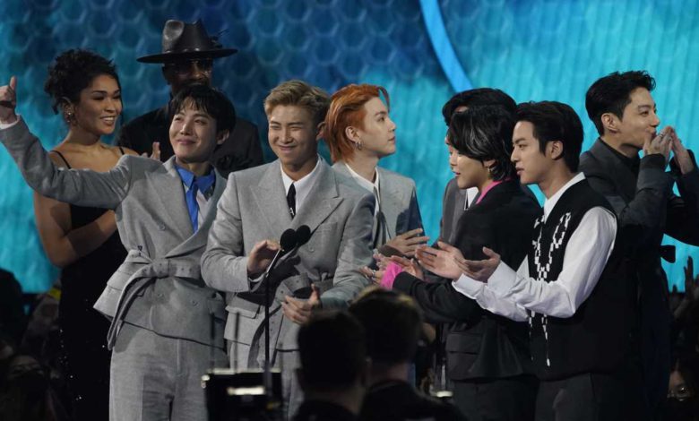 South Korean superstars BTS were crowned artist of the year at the American Music Awards on Sunday, brushing aside challenges from Taylor Swift, Drake and The Weeknd as they took home a total of three awards and teamed up with Coldplay for a raucous "My Universe" and closed the show with "Butter.""Seven boys from Korea, united by love for music, met the love and support from all the armies all over the world," said BTS' RM after the group won their artist of the year for the first time. "This whole thing is a miracle. Seriously, we would never take this for granted." The band was also named favorite pop duo or group and got the favorite pop song award for "Butter." The show celebrated the best popular music for a second pandemic year with a mix of live and pre-taped performances. Silk Sonic's Bruno Mars and Anderson .Paak kicked off the awards on a funky, R&B and pre-taped note with their "Smokin Out the Window" and Jennifer Lopez pre-taped her "On My Way" from her upcoming romantic comedy "Marry Me."An earlier scheduled performance of "Butter" by BTS and Megan Thee Stallion was scrapped after the rapper cited personal reasons for dropping out Saturday. She turned out to be a big winner: named favorite female hip-hop artist, her "Good News" winning for favorite hip-hop album and her "Body" was crowned favorite trending song, a new award this year.Olivia Rodrigo came into the night with a leading seven nominations but only took home the crown for favorite new artist of the year. "Writing songs is my favorite thing in the whole world and I am so grateful for everyone who has embraced my music," she said.Rodrigo lost favorite pop album to Taylor Swift's "evermore." In a taped speech, Swift told her fans: "I'm so lucky to be in your life." Swift also won for favorite female pop artist, giving her a career total of 34, the record for the most awarded artist in AMA history.Rodrigo performed her hit "traitor" live on a stage covered with flowers and Carrie Underwood and Jason Aldean brought a little country to the stage when they sang their pre-taped duet "If I Didn't Love You." With a little help from Julieta Venegas and Tainy, Bad Bunny performed their hit "Lo Siento BB :/." Among live performances, Italian band Måneskin made their U.S. awards show debut with their viral hit "Beggin.'" Chlöe of Chloe x Halle floated down onto the stage to perform her hit debut single as a soloist "Have Mercy," swinging her hair and twerking. Mickey Guyton got loud cheers while singing her patriotic song "All American" in a silvery dress, periodically screaming out "How y'all doing?" The fan-voted awards show aired live from Los Angeles on ABC. Nominees were based on streaming, album and digital sales, radio airplay and social activity, and reflect the time period of Sept. 25, 2020, through Sept. 23, 2021.Becky G won for favorite female Latin artists and thanked the Latinx community. "You are not alone," she said. "We are the American dream."Machine Gun Kelly grabbed the favorite rock artist award. "I want to accept this for all the aspiring musicians, the one who desires to play an instrument, wants to rap, wants to sing — not just the rock artists, but all the artists," he said.Earlier Sunday, in awards announced before the show, Swift was named favorite female pop artist, Ed Sheeran got the favorite male award and Doja Cat featuring SZA on "Kiss Me More" was named collaboration of the year. Kanye West was named favorite gospel artist.Underwood won for favorite inspirational artist and favorite female country artist and Doja Cat also won two other awards: favorite female R&B artist and her "Planet Her" was named favorite R&B album.Luke Bryan was named favorite country artist and Bad Bunny was the favorite male Latin artist. The Weeknd was crowned favorite male R&B artist and Drake won the favorite male hip-hop artist. Gabby Barrett took home the favorite country album for "Goldmine" and favorite country song for "The Good Ones."For the older viewers, New Edition and New Kids on the Block performed together. The Boston-based groups took turns with the hits, trading hits: "You Got It (The Right Stuff"), "Candy Girl," "Step By Step," "Mr. Telephone Man" and uniting for "Can You Stand the Rain," "Is This the End," "Hangin' Tough" and "If It Isn't Love."The favorite Latin album went to Bad Bunny's "El Último Tour Del Mundo." Host Cardi B, wearing a constant stream of new outfits, revved up the crowd. Later her song "Up" was named favorite hip-hop song. The Associated Press was not able to transmit images of Cardi B while she was onstage because her representatives required approval, a restriction the AP would not accept.