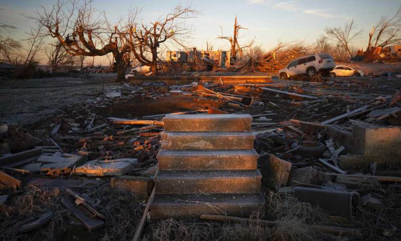Several communities are completely leveled. Debris from destroyed buildings and shredded trees covered the ground in Mayfield, a city of about 10,000 in western Kentucky. Twisted metal sheeting, downed power lines and wrecked vehicles lined the streets.