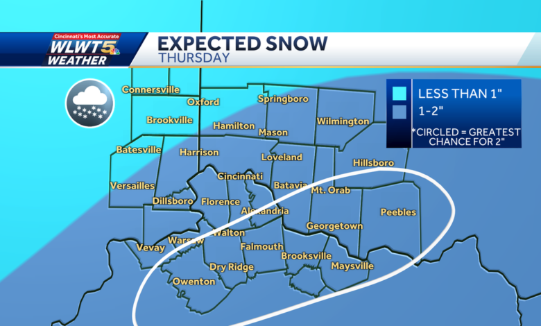 Overall, northwest of Hamilton County gets an inch or less. The metro and along I-71 will pick up around an inch. Areas southeast of I-71 and south of the 71-75 split have the best chance of getting 2 inches of snow.