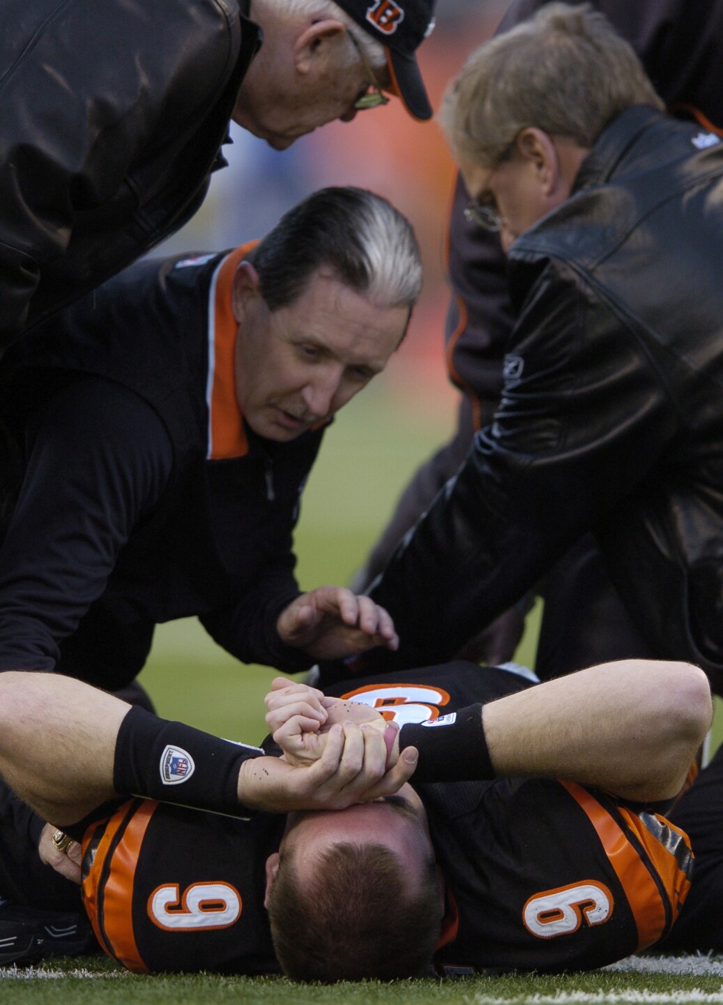 On Cincinnati's second play from scrimmage, Palmer threw a bomb down the right sideline to rookie wide receiver Chris Henry. Pittsburgh defensive lineman Kimo von Oelhoffen hit Palmer low after the play, tearing the ACL and MCL in Palmer's knee. He was carted off the field as fans in the stadium stood in shock.