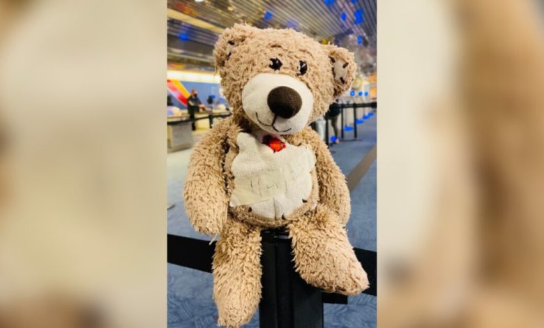 The bear, the airport pointed out, is special because it's given to children who are born with congenital heart defects.