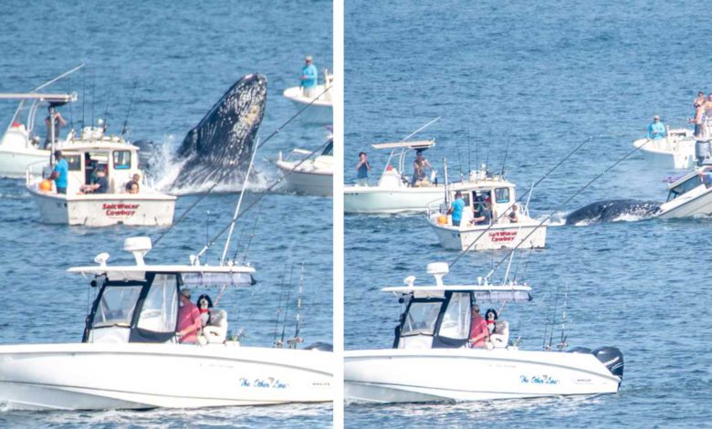 A viewer captured photos of the whale as it breached with several fishing boats nearby. The whale appears to strike one of the boats, causing the bow to dip down into the water.