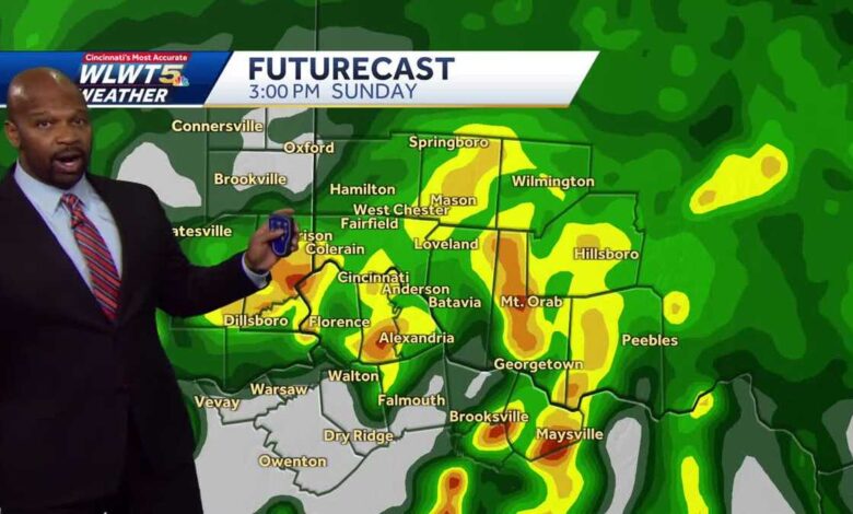 VERY BRIGHT MAN BRINGING SMILES TO A LOT OF PEOPLE. AND HE DID NOT TAKE HIMSELF TOO SERIOUSLY. HE CERTAINLY DIDN’T. TODAY’S SERVICE REALLY WAS THAT SELLABLE STATION WHERE PEOPLE WERE LAUGHING AND REALLY CELEBRATING THE WAY THEY THINK HE WOULD WANT TO BE ADMIRED. KEVIN’S HERE AND THE BIG DEAL IS THE RAIN IS FINALLY GOING TO BE HERE TRYING TO PIN DOWN EXACTLY WHEN IT COMES INTO THE PICTURE THIS WEEKEND. WELL, IT LOOKS LIKE PROBABLY SOMETIME SOME OF THE FIRST WET WEATHER WILL GET IN HERE EARLY SUNDAY MORNING. BUT I THINK THE BULK OF THE RAIN COMES SUNDAY AFTERNOON INTO SUNDAY EVENING AROUND HERE. AND BY THE BULK OF THAT, THIS MAY ACTUALLY BE THIS WILL BE THE MOST RAIN WE’VE IN PROBABLY OVER A MONTH AROUND BECAUSE THERE ARE PARTS OF THE TRI-STATE THAT ARE GOING TO GET A BIG, BIG GULP OF WATER THIS WEEKEND AND REALLY HELP OUT WITH THESE DRY CONDITIONS WE’VE BEEN EXPERIENCING HERE AS OF LATE. SO WE’VE GOT THE THREAT FOR STORMY WEATHER MOVING IN ON SUNDAY. AND YES, WE’RE GOING TO DEAL WITH MORE HAZE AND SMOKE AROUND HERE AS WELL. IN FACT, THAT’S WHERE I’M GOING TO START TONIGHT, BECAUSE NOTICE THAT AREA OF KIND OF DARKER GRAY WE WERE TALKING ABOUT WITH SOME OF MORE DID SMOKE IN HAZIER CONDITIONS. NOTICE HOW THAT IS SLOWLY STARTING TO WORK ITS WAY DOWN TOWARDS THE OHIO RIVER AS ANTICIPATED LOCALLY AT THE MOMENT, OUR AIR QUALITY IS IN THE MODERATE RANGE, BUT AS YOU START HEADING UP TOWARDS TRENTON, FOR EXAMPLE, THEY HAVE SLIPPED INTO THE UNHEALTHY FOR SENSITIVE GROUPS. AND THEN THE DAYTON AREA OVER TOWARDS INDIANAPOLIS. SO WE’LL HAVE TO KEEP AN EYE ON THIS. I STILL THINK WE’LL HAVE SOME AIR QUALITY ISSUES THROUGH SATURDAY. HENCE THE REASON WHY AIR QUALITY ALERT HAS BEEN EXTENDED INTO TOMORROW. SO WE’LL NEED TO SEE JUST HOW BAD IT GETS. BUT I CERTAINLY THINK THERE COULD BE SOME AIR QUALITY ISSUES TO BEGIN THE WEEKEND. THE OTHER BIG STORY HAS BEEN THE ABNORMALLY DRY CONDITIONS. AND HOW HAVE, IF NOT MOST OF THE DRY STATE IS NOW UNDER WHAT WE CONSIDER TO BE A MODERATE. THE GOOD NEWS IS WE CAN PUT A PIN IN THAT THAT’S ABOUT AS BAD AS IT’S GOING TO GET. I THINK IT’S AS DRY AS IT’S GOING TO GET RIGHT NOW BECAUSE EVERYTHING SUGGESTS THAT. WELL, IT’S ABOUT TO START RAINING AGAIN AND MAYBE A LITTLE MORE FREQUENTLY THAN WE EVEN WANT. SO LET’S WALK YOU THROUGH THIS HERE, BECAUSE FUTURE CAST IS QUIET TONIGHT. YOUR SATURDAY LOOKS BEAUTIFUL. WILL BE A WARM DAY, HAZY OBVIOUSLY ANY AND WE’LL NEED TO WATCH THE AIR QUALITY. BUT ASIDE FROM THAT NOTHING REALLY ACTIVE IN THE WEATHER SCHEME SATURDAY NIGHT IS RELATIVELY QUIET. HERE WE ARE SUNDAY MORNING. I THINK IT DOES START DRY EARLY ON SUNDAY, BUT WE’LL PROBABLY GET IN SOME SHOWERS BEFORE LUNCHTIME, EARLY AS LATE MORNING THERE, I THINK. AND THEN INTO THE AFTERNOON AND EVENING. THE THREAT FOR SOME SHOWERS AND STORMS ACROSS THE AREA. I KNOW WE HAVEN’T TALKED MUCH ABOUT SEVERE WEATHER RIGHT? THAT’S RIGHT. WE COULD HAVE A FEW STRONG STORMS IN HERE ON SUNDAY. I’M NOT TERRIBLY WORRIED ABOUT SEVERE WEATHER, BUT SOME OF THOSE STORMS COULD PACK A PUNCH WITH GUSTY WINDS RIGHT. AND IT LOOKS LIKE WE COULD HAVE OFF AND ON RAIN MOST LIKELY RIGHT THROUGH THE NIGHT ON SUNDAY. AND WHILE I DON’T WANT YOU TO HANG ON PER, SAY TO THESE TOTALS IN ANY ONE PRECISE LOCATION AND HOWEVER THERE HAS BEEN A STRONG SIGNAL FOR A SWATH OF 1 TO 2 INCH RAINFALL AMOUNTS TO APPEAR PRETTY CLOSE TO THE I-70 ONE CORRIDOR. IF THAT WERE TO HAPPEN, THAT’D BE A SAVING GRACE. THAT’S EXACTLY WHAT WE NEED RIGHT ACROSS THE HEART OF THE TRI STATE. SO WE’LL SEE HOW THINGS PLAY OUT. BUT I THINK WE’VE GOT A BIG DRINK OF WATER COMING OUR WAY SOMETIME ON SUNDAY. OUTSIDE NOW 64 DEGREES. THE WEATHER HAS BEEN BEAUTIFUL FOR A PATIO THIS EVENING. YOU’RE IN THE FIFTIES IN HARRISON, 61 IN WILMINGTON, 60 AMOUNT OR 60 DOWN THERE IN DRY RIDGE. SKIES ARE CLEAR. SO IT’S QUIET TONIGHT. TEMPERATURES WILL CONTINUE TO SLIP DOWN THROUGH THE SIXTIES AND EVENTUALLY WE’LL GET DOWN INTO THE LOW TO MID FIFTIES BY MORNING AND WE SHOULD WARM UP PRETTY FAST TOMORROW. SO HAZY AND COMFORTABLE THE REST THE NIGHT. 54 FOR YOUR LOW TOMORROW. WARM SUNSHINE BUT STILL NICE. KEEP AN EYE ON THE AIR QUALITY 84 FOR A HIGH HERE’S YOUR DAY PLANNER. SHOULD WE HAVE MANAGED TO AVOID ANY OF THOSE DETERIORATING AIR CONDITIONS? IT SHOULD BE A NICE WARM DAY LIKE HERE’S YOUR SEVEN DAY FORECAST. SO SUNDAY, OBVIOUSLY A WEATHER IMPACT DAY. I’LL BE IN HERE ON SUNDAY TO KEEP AN EYE ON ANY OF THAT ACTIVITY AND THEN A LITTLE COOLER TO START NEXT WEEK, MONDAY AND TUESDAY BEFORE THOSE MORE FREQUENT RAIN CHANCES I WAS SPEAKING OF BEGINNING TO SET UP, GOING TOWARDS THE SECOND HALF OF NEXT WEEK. KEVIN, THANKS FOR LAYING IT OUT