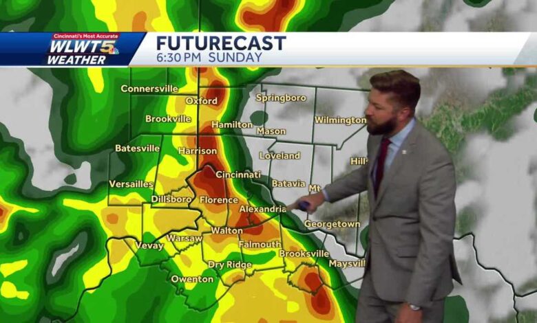 PATCHES. BUT AS WE TAKE YOU OVER TO OUR LIVE RADAR, YOU SEE A CLEAN SWEEP RIGHT NOW. BUT IF YOU LOOK DOWN 71 FURTHER TO THE SOUTHWEST OF PARTS OF CARROLL COUNTY, GETTING INTO AREAS JUST WEST OF OCEAN COUNTY, YOU ARE SEEING A LITTLE BIT OF THAT RAIN THAT IS MOVING THROUGH TO TO THE NORTHEAST OF LOUISVILLE. EVEN ONE LITTLE LIGHTNING STRIKE SHOWING UP THERE. THAT’S GOING TO MOVE ITS WAY EVENTUALLY IN THROUGH PARTS OF CARROLL GALLATIN AND POSSIBLY EVEN OHIO, SWITZERLAND COUNTIES. WE ALSO HAVE A LITTLE BIT DOWN NEAR CENTRAL KENTUCKY THAT MAY JUST TRIM BY PARTS OF MASON ADAMS COUNTY THAT WE’LL BE WATCHING. THIS IS ALL KIND OF JUST SOME EARLY RAINFALL THAT WE’RE GOING TO BE SEEING OUT ACROSS OUR REGION. WE’RE STILL WATCHING THAT LOW PRESSURE THAT’S SPINNING OUT HERE THROUGH PARTS OF MISSOURI. AND THOSE SHOWERS, THAT KIND OF STRETCH DOWN THROUGH THE AREA THAT’S GOING TO BE MOVING INTO OUR REGION AS WE GO THROUGH PARTS OF THIS MORNING. AND THEN WE HAVE A SECOND ROUND THAT MOVES IN FOR THE EVENING. AND THAT SECOND ROUND COULD BRING A LITTLE BIT OF SEVERE WEATHER TO OUR REGION. THE BEST THREAT IS FURTHER TO THE SOUTH. BUT HERE IN CINCINNATI, ACROSS SOUTHERN OHIO, THAT’S WHERE WE ARE SEEING A SLIGHT RISK FOR SEVERE WEATHER. IT’S A LEVEL TWO OUT OF FIVE FROM THE STORM PREDICTION CENTER. YOU SEE IT COVERING MUCH OF HAMILTON AREAS TO THE SOUTHEAST. AREAS OF BUTLER UP TOWARDS PARTS OF BROOKVILLE THERE AND FRANKLIN COUNTY, WAVERLY COUNTY, DEARBORN, PARTS OF THOSE MORE INTO THAT MARGINAL RISK THAT REALLY THE FURTHER NORTH YOU ARE, THE LOWER THE CHANCES OF SEVERE STORMS. AND THE MAIN IMPACTS WE’RE GOING TO BE SEEING IS MOSTLY JUST SOME STRONG WINDS. IF WE SEE IT, BUT OTHERWISE JUST IT’S GENERAL HEAVY RAINFALL AND SOME GUSTY STORMS, HIGHER IMPACTS GOING TO BE MOVING IN FOR THIS AFTERNOON AND EVENING THIS MORNING INTO THE MID DAY. IT’S MEDIUM IMPACTS TO LOW IMPACTS BECAUSE AS WE SEE THIS WARNING JUST JEN, A LITTLE SCATTERED SHOWERS THAT ARE MOVING THROUGH AS WE GET INTO NINE, TEN, 11:00, WE’LL SEE A LITTLE BIT MORE ACTION SHOWING UP ON RADAR. BUT AGAIN, A LOT OF THIS SHOULDN’T NECESSARILY BE THE SEVERE THREAT IN THE FORECAST AS WE GET INTO THE AFTERNOON. THAT SYSTEM MOVES TO THE NORTH. WE SEE A LITTLE BIT OF A BREAK BACK FOR PARTS OF OUR AREA THAT COULD HELP BOOST THOSE TEMPERATURES. AND THEN AS WE HEAD INTO THE EVENING, THEN WE SEE THESE SHOWERS AND STORMS THAT START TO BLOW IN HERE BETWEEN FOUR OR FIVE, POSSIBLY EVEN SIX OR 7:00 FOR PARTS OF CINCINNATI, THEN AREAS TO THE EAST A LITTLE BIT LATER, SIX, SEVEN, EIGHT, AND POSSIBLY FOR YOUR AREAS. AND THAT’S GOING TO BE BLOWING THROUGH WITH SOME GUSTY WINDS AND SOME THEN SOME SCATTERED SHOWERS LEFT OVER ON THE BACK SIDE OF THIS. SO A LOT OF MUCH NEEDED RAIN WE’RE SEEING AROUND 1 TO 1 AND A HALF INCHES, POSSIBLY EVEN A LITTLE MORE IN SOME ISOLATED AREAS FOR TODAY. SO THAT’S VERY HELPFUL. TEMPERATURES CAN BE STUCK AROUND THE UPPER SEVENTIES, MAYBE AROUND 80 FOR SOME AREAS IN NORTHERN KENTUCKY. BUT THIS RAIN HELPING COOL US DOWN FOR NEXT WEEK. AS YOU SEE, WE’RE DOWN INTO THE LOWER SEVENTIES FOR MONDAY AND STRAY SHOWERS AND THEN IT DRIES OUT FOR THE AFTERNOON WITH MID SEVENTIES ON TUESDAY BEFORE WE WARM BACK UP TO MORE OF A NORMAL FEEL FOR T