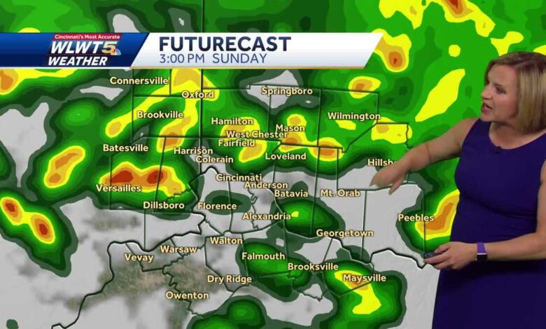 DON’T SHOW IT AS TO I WILL. AND I WILL BE TRAVELING. I’LL BE FILMING IT FROM THE TOP. CREDIT VACATION. MAKE SURE YOU DON’T GET RECURRING. I LOVE IT. WELL, ABOUT THE WEATHER. FINALLY, SOME GOOD NEWS WITH SOME RAIN ON THE WAY TOMORROW. YES, WE DO HAVE RAIN AND THUNDERSTORMS. AND FIRST THING IN THE MORNING, PROBABLY NOT AS BIG OF A DEAL, BUT THE LATER YOU GO IN THE DAY, THE MORE OF AN IMPACT IT’S GOING TO HAVE. AND WE HAVE A CHANCE FOR SOME THUNDER AND LIGHTNING AS WELL. SO IF YOU’RE LOOKING AT THE CALENDAR FOR SUNDAY AND WHAT YOU HAVE GOING ON, WELL, IN THE MORNING, THE IMPACTS ARE PRETTY LOW. WE’LL START TO SEE THOSE RAIN SHOWERS MOVING IN FROM THE SOUTH AND WEST BY MID-MORNING AS WE GET CLOSER TO ONE SHOWER, BECOMING A BIT MORE WIDESPREAD, FRED. BUT IT’S REALLY THROUGH THE AFTERNOON AND EVENING THAT YOU’RE SEEING THE HEAVIER DOWNPOURS AND THE POTENTIAL FOR SOME THUNDER AND LIGHTNING. SO IT’S BEEN DRY FOR A WHILE AROUND HERE. WE’VE BEEN DEALING WITH THE SMOKE. YOU PROBABLY NOTICE A LITTLE BIT OF THAT ORANGE HAZY HUE ON AT SUNSET TONIGHT. BUT OUR WINDS HAVE SHIFTED OUT OF THE SOUTH AND WEST AND THAT HELPED TO CLEAR SOME OF THAT SMOKE. THIS APPROACHING SYSTEM. WE’LL DO THE REST OF THE JOB. SO LET’S TAKE A LOOK AT THE FUTURE CAST HERE AS WE GO THROUGH THE OVERNIGHT HOURS. WE START OUT WITH CLEAR SKIES, BUT BY THE TIME WE GET UP TOMORROW MORNING, THE CLOUDS ARE ALREADY IN PLACE. AND I THINK THIS IS PROBABLY A LITTLE BIT AGGRESSIVE WITH THE ARRIVAL TIME WITH THAT RAIN. BUT IF YOU ARE TO OUR EXTREME SOUTHWESTERN COMMUNITIES, YOU COULD A SHOWER TOWARD FIVE OR 6:00 IN THE MORNING. BUT FOR MOST IT WILL BE AFTER 9 A.M. BEFORE THAT RAIN STARTS TO MOVE IN, IT WILL START TO OVER SPREAD THE AREA. AT FIRST, JUST PLAIN OLD RAIN SHOWERS. BUT ONCE WE GET INTO THE AFTERNOON, THE POTENTIAL IS THERE FOR SOME THUNDERSTORMS. AND I THINK THE BIGGEST CHANCE FOR THUNDERSTORMS KICKS IN BETWEEN ABOUT 2 P.M. AND 6 P.M. SO HERE WE ARE AT 1:00 ON SUNDAY. YOU COULD SEE PRETTY WIDESPREAD WITH THAT RAIN THUNDERSTORMS RIGHT IN THE MIDDLE OF THE AFTERNOON. AND ANY ONE OF THESE COULD POTENTIALLY HAVE SOME SMALL HAIL OR SOME GUSTY WINDS WITH IT INTO THE EVENING. STILL LOOKING AT SOME INTENSE DOWNPOURS AND YOU’LL SEE THIS CONTINUES THROUGH ABOUT SUNSET SET ON SUNDAY NIGHT. THEN WE GET RID OF THE THUNDER AND LIGHTNING AND WE TRANSITION OVER TO PLAIN OLD RAIN SHOWERS THAT WILL MOVE OUT AFTER MIDNIGHT AND LEAVE US WITH CLOUDY SKIES AND MAYBE A STRAY SHOWER FIRST PART OF THE DAY ON MONDAY, BUT EVENTUALLY SOME SUNSHINE ON MONDAY AFTERNOON. SO FOR YOUR SUNDAY 9 A.M., MOST PLACES PRETTY DRY. WE’RE AT 67 DEGREES. WE HIT NOON. I PUT THAT WEATHER IMPACT SYMBOL THERE WILL BE ABOUT 75 DEGREES SCATTERED RAIN AND THEN AMPING UP TO THOSE SCATTERED STORMS THROUGH THE MIDDLE OF THE AFTERNOON AND INTO THE EVENING HOURS. AND 2 P.M. TO 6 P.M. IS PROBABLY THE MOST LIKELY TIME TO HAVE THE THUNDERSTORMS IN YOUR AREA. AND THEN RAIN TAPERS AS WE GO INTO THE OVERNIGHT. IT’S GOING TO BE A GOOD SOAKING AND WE NEED IT. SO CHECK OUT THE EXPECTED RAINFALL. MOST PLACES COULD PICK UP AN INCH TO AN INCH AND A QUARTER OF RAINFALL BY THE TIME WE GET TO MONDAY MORNING. AND WELL, CHANCES ARE GOOD THIS IS JUST PLAIN OLD RAIN AND THUNDERSTORMS. WE DO HAVE A MARGINAL WHICH IS THE LOWEST LEVEL THREAT FOR SOME STRONGER STORMS IN THE MIDDLE OF THE AFTERNOON, EARLY EVENING, GUSTY WINDS, MAYBE SOME HAIL. SO TONIGHT WE’RE DROPPING DOWN TO 60, INCREASING CLOUDS, BUT WE STAY DRY AND THEN TOMORROW, A WEATHER IMPACT DAY WITH RAIN AND THUNDERSTORMS MAINLY IN THE AFTERNOON AND EVENING. FOR MONDAY, A STRAY SHOWER AND 72 IS THAT COLD FRONT? DOES ITS THING AND DROPS OUR TEMPERATURES DOWN TO THE 70 FOR HIGHS TO START OUT NEXT WEEK. ALL RIGHT, RANDI, THANKS.