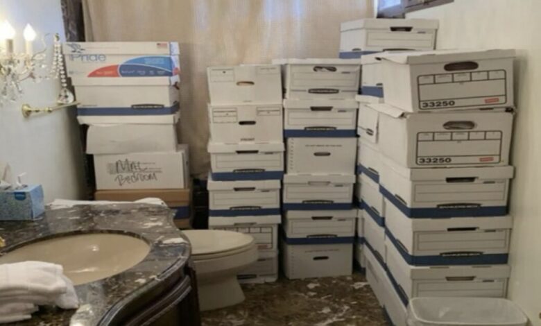 Photos in the indictment include boxes stacked on a ballroom’s stage, in a storage room, in a bathroom and its shower space and in an office.