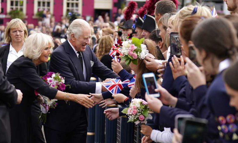 Charles and his wife Camilla, the Queen Consort, got out of their car to meet villagers — waving to the crowd and sometimes using both hands to reach out to people, including schoolchildren in bright blue uniforms.