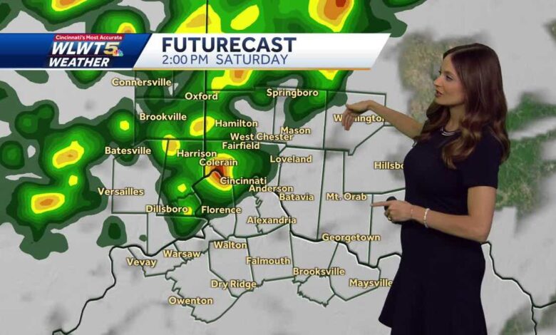 WASHINGTON PARK RIGHT. A LOT OF YOU WERE OUT AND ABOUT TONIGHT WITH A LOT OF PLANS OUT THERE. AND LUCKILY THE WEATHER COOPERATES TONIGHT. YES, BUT TOMORROW NIGHT MIGHT BE A LITTLE BIT TRICKIER. WE’VE GOT A COLD FRONT MOVING THROUGH THAT’S GOING TO BRING SOME SHOWERS AND THUNDERSTORMS FOR PART OF YOUR WEEKEND OUTSIDE RIGHT NOW, THOUGH, IT’S QUIET AND IT’S CLEAR OUTSIDE. THAT WIND CONTINUES TO CALM DOWN AND DEW POINT STILL SITTING IN THE LOWER 60. SO STILL NOT FEELING TOO HUMID OUTSIDE RIGHT NOW. 77 IN CINCINNATI SO FAR. AND TEMPERATURES TONIGHT CONTINUE TO DROP DOWN TO THE UPPER SIXTIES BY TOMORROW MORNING. SO NICE AND COMFORTABLE. START AS WE KICK THINGS OFF FOR YOUR SATURDAY. BUT IT’S NOT GOING TO STAY THAT WAY AT THE MOMENT. WE’VE GOT HIGH PRESSURE SO KIND OF HELPING TO KEEP OUR SKY DRY, AT LEAST NOT SO MUCH IN TERMS OF CLEAR. WE DO HAVE SOME CLOUDS THAT ARE STARTING TO MOVE IN HERE AND THAT INCREASE IN CLOUD COVER WILL CONTINUE OVERNIGHT TOMORROW. I DO THINK WE START OFF DRY, BUT THEN TOMORROW AFTERNOON WE’LL BEGIN TO SEE THIS LITTLE STORM CENTER RIGHT HERE MAKING ITS WAY CLOSER AND CLOSER TO THE QUEEN CITY THAT IS GOING TO ALLOW FOR SHOWERS AND THUNDERSTORMS TO SPARK TOMORROW DURING THE AFTERNOON, SOME OF WHICH COULD PACK A LITTLE BIT OF A PUNCH. SO HERE’S WHAT WE’RE LOOKING AT FOR THE ENTIRE WEEKEND. TOMORROW, STARTING OFF MAINLY DRY, RIGHT? CLOUDY OUTSIDE, STARTING TO GET A LITTLE BIT HUMID. WE BEGIN TO SEE THE MOISTURE INCREASING, ACTUALLY GOING TO HAVE KIND OF A WARM FRONT LIFTING THROUGH FIRST. AND THAT’S GOING TO ALLOW FOR THE INCREASE IN CLOUDS INCREASE IN MOISTURE IN OUR ATMOSPHERE AND EVENTUALLY FUELING SOME THUNDERSTORMS THAT ARRIVE TOMORROW AFTERNOON AND STICK AROUND FOR THE EVENING AS WELL. THESE ARE GOING TO BE SO I DON’T NECESSARILY THINK IT RAINS EVERYWHERE, THE ENTIRE AFTERNOON OR EVENING, BUT I DO THINK PRETTY MUCH EVERYBODY AT SOME POINT IS GOING TO WIND UP WITH RAIN AND POSSIBLY EVEN A THUNDERSTORM AROUND. THEN SUNDAY, WE’LL STILL HAVE A LITTLE BIT OF RAINFALL STICKING AROUND FOR A COUPLE OF COMMUNITIES, I THINK ESPECIALLY EAST. THAT’S WHERE A LOT OF THE RAIN LOOKS TO LAST A LITTLE BIT LONGER INTO SUNDAY MORNING. SO HERE IT IS ON FUTURE CAST WILL STAY DRY TONIGHT. SO DON’T NEED TO REALLY SHOW YOU WHAT’S GOING ON TONIGHT. TOMORROW WE’LL HAVE THE CLOUDS AROUND FIRST THING AND FUTURE CAST STILL WANTS TO HINT AT A COUPLE OF SHOWERS ARRIVING EARLY TOMORROW MORNING. BUT I DO THINK FOR THE MOST PART, YOU CAN PLAN ON A DRY START TOMORROW MORNING, BUT THEN AS WE GET TO THE MIDDLE OF THE DAY, RAIN CHANCES START TO GO UP A LITTLE BIT. THIS IS GENERALLY GOING TO BE IN FROM THE WEST AND THEN EDGING ITS WAY EAST THROUGHOUT THE REST OF THE AFTERNOON. SO SOME OF THESE SHOWERS AND THUNDERSTORMS AT FIRST SCATTERED, BUT THEN OCCASIONALLY BECOMING A BIT MORE WIDESPREAD HERE WE ARE BY ABOUT FIVE AND 6:00 TOMORROW AND WE STILL HAVE NUMEROUS THUNDERSTORMS AROUND GREATER CINCINNATI. SOME OF THESE, AS I MENTIONED EARLIER, COULD PACK A PUNCH. SO THIS MEANS THAT WE COULD HAVE SOME ISOLATED THUNDERSTORMS BRINGING IN SOME GUSTY WINDS, SOME HEAVY RAINFALL, LIGHTNING AND THUNDER, OF COURSE, ALSO A POSSIBILITY. SO SEVERE WEATHER I’M NOT NECESSARILY EXPECTING IT, BUT THERE IS STILL THAT POTENTIAL WHERE WE COULD HAVE AN ISOLATED STRONG THUNDERSTORM THAT WINDS UP TAPPING INTO ENOUGH ENERGY. THAT BECOMES A LITTLE BIT STRONG FOR US. THEN OVERNIGHT, WE’LL STILL HAVE A FEW SHOWERS LINGERING AND THEN SUNDAY, OUR EASTERN ZONES GENERALLY IS 71 TO THE EAST. I HAVE THE POTENTIAL FOR SOME RAINFALL CONTINUING THROUGH THE DAY, BUT I DO THINK WE START TO DRY OUT BY ABOUT SUNDAY AFTERNOON, SUNDAY EVENING. SO AT LEAST BY THE END OF SUNDAY, WE START TO SEE SOME BETTER WEATHER MOVING IN HERE. SO TOMORROW IS A WEATHER IMPACT DAY BECAUSE OF THAT POTENTIAL FOR SOME ISOLATED STRONG THUNDERSTORMS. AND I DO THINK THIS ALSO POTENTIALLY HAS AN IMPACT ON SOME PLANTS. IF YOU ARE HEADED OUT TO THE POOL TOMORROW AFTERNOON OR EVENING, THAT MIGHT INDICATE OTHERWISE. THE REST OF THE WEEK STARTS OFF ACTUALLY PRETTY NICE UNTIL WE GET TO THE SECOND HALF WITH A CHANCE OF MORE THUNDERSTORM ON THURSDAY AND FRIDAY, MAKING QE3. ALL RIGHT, ALISO