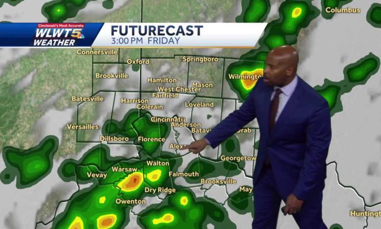 LET’S GET A CHECKT A OUR WEATHER WITH CHIEF METEOROLOGI.ST KEVIN ROBINSON. HEY, KEVIN HEY LADIES. YEAH, YOU KNOW WHAT S FOAR THINGS HAVE BEEN PRETTY GOOD OUT THERE THIS AFTERNOON. WE’VE HAD SOME CLOUDS THROUGHOUT THE FIRST HALF OF THE DAY, BUT NOW THEOS ARE GETTING OUT OF HEREND A IT’S REVEALING SOME SUNSHINE OR ALLOWING SOME SUNSHINE TO COME OUT. SO WE’RE LOOKING FORRDWA TO A WARMND A DRY EVENING AROUND THE TRI-STATE RADAR IS ALL QUIET. THERE ARE SOME SHOWERSND A STORMS THOUGH TO OUR NORTH AND THAT’S WHERE THEY’RE GOING TO STAY TIGHTON NORTH AND WEST OF INDIANAPOLIS, BUT I’M SHOWING YOU THE BIG PICTURE HERE BECAUSE I WANT TO DRAW YOUR ATTENTION TO THIS STRONG STORM CENTER THAT’S DEVELOPING BACK INHE S THOW ME STATE BACK IN MISSOURI TONIGHT. BECAUSE THIS IS THE ONE THAT BASILLCAY IS GOINGO T RACE UP TOWARDS CLEVELAND TOMORROW AND DRAG A STRGON COLD FRONT SWEEPING ACROSS THE OHIO VALLEY AS IT DOES SO AND THAT FRONT IS GOING TO BRING A CLASH OF THE AIR MASSESR O A CLASH OF EVEN SEASONS REALLY, OF COURSE, WE’VE HAD THIS KIND OF WMAR LATE SUMMER WEATHER HEER THROUGH MUCH OF OCTOBER. WE’RE FINALLY AUTBO TO GET SOME MO RE OCTOBER LIKE WEATHER AND THE CONTRAST TO THOSE TWO AIR MASSES KIND OF BATTLING IT OUT THROUGH THE, OHIO VALLEY. WILL BRING THE POTENALTI FOR SOME STRGON THE SEVERE STORMS TOMORROW AFTERNOON AND EVENING FOLLOWED BY CEON THE FRONT SWEEPS THROUGH A MUCH COOLER WEENEKD, SO YOU CAN SEE HERE. HERE’S OUR SLIGHT RISK FOR SEVERE WEATHER YESTERDAY. WE WERE IN A MARGINAL RISK,ND A I THOUGHT WELL IF THE TREND CONTINUES WIT WHHAT I’M SEEING OUT THERE I, THINK A SLIGHT RISK IS PROBABLY MORE WARRANTED AND THAT SEEMS TO BE THE CASE BASICALLY RIGHT DOWN THE I-71 CORRIDOR FROM CLEVELAND TO COLUMBUS TO CINCINNATI TO LOUISVILLE. AND THEN ALL THE WAY BACK DNOW TOWARDS MEMPHIS THE WESTERN PART OF TENNESSEE. WE’VE GOT S ALIGHT RISK FOR SEVERE WEATHER ESSENTIALLY ALONG THE ENTIRE LENGTH OF THE OHIO VAEYLL TOMORROW AFTERNOON AND EVENING ALL MODES OF SEVERE WEATHER ARE CERTAINLY LOONGKI POSSIBLE AND THAT INCLUDES DAMAGING WINDS HEAVY RAINFALL, AND YES, MAYBE EVEN A FEW BRIEFS SPIN UP TORNADOES ARE A POSSIBILITY AS WELL TOMORROW AFTERNOON AND TOMORROW EVENING NOW RIGHT NOW IF I HAD TO REALLY PINPOINT OR HIGHLIGHT AN AREA THAT I THOUGHT LEAST THE GREATEST THREAT FOR SEVERE WEATHER IN THE TRI-STATE. IT WOULD GENERALLY BE JUST NEAR AND SOUTHEAST OF INTERSTATE 71 SO THAT COLD FRONT COMES THROUGH KNOCKS THE TEMPERATURES DOWN FRIDAY AND THE SATURDAY BY THE TIME YOU WAKE UP SATURDAY MORNING. THE RAIN SHOULD BE OUT OF HERE SHOW Y FOUUTURE CAST. IT’S QUIET THROUGH THE NIGHT TONIGHT. ALTHOUGH THERE WILL BE SOME STORMS GETTING AWFULLY CLOSE TO SOME OF OUR SOUTHEASTERN INDIANA COMMUNITIES. WE’LL WATCH IT. BUT I THINK IT’S MOSTLY DRY OVERNIGHT. I WON’T RULE OUT A STRAY SHOWER TOWARDS MORNING ON FRIDAY AS RAIN CHANCES. UP. I THINK WE’LL HAVE SOMEFF O AND ON DOWNPOURS THROUGHHE T DAY AND THEN HERE’S WHAT’S INTERESTING WATCH WHAT HAPPENS TOMORROW AFTERNOON AND EVENING NOTICE THE ERUPTION OF STORMS, ESPECIALLY SOUTH AND EAST OF 71. STILL GOING TO BE STORMING HERE IN THE MROET AS WELL. IN FT,AC I SEE THUNDER AND LIGHTNING CERTAINLY ALL IMPACTING HIGH SCHOOL FOOTBALL GAMES AROUND THE AREA TOMORROW NIGHT. IT LKSOO LIKE A STORMY EVENING FOR THE AREA. SO EXPECT DELAYS AND/OR CANCELLATIONS AND IN THE RAIN CONTINUES THROUGH THE NIGHT BEFORE UP FIRST THING SATURDAY MORNING. SO OUTSIDE RHTIG NOW, WE’RE 78 OFFICIALLY AT THE AIRPORT BACK DOOR THOUGH IN A LOT OF COMMUNITIES TEMPERATURES ARE AT 80 OR EVEN A COUPLE OF DEGREES ABOVE CHECK HAMILTON 82 HARRISON AT 80 LOVELAND MASON ALL INTO THE LITTLE 80S THIS AFTERNOON. SO HERE’S YROU 12 HOUR FORECAST. ENJOY THE QUIET WEAERTH THIS EVENING AND THE MEIL NIGHT WITH TEMPERATURES ONLY SLIPPING THROUGH THE 70S. WE’LL GET TO 67 BY MORNING AGAIN. SMALL CHAENC FOR A STRAIGHT SHOWER. STMO OF US ARE DRY OFF AND ON DOWNPOURS. TO DEVELOP TOMORROW MORNINGHE T THREAT FOR SOME STRONG SEVERE STORMS IN THE AFTERNOON TO EVENING. I DON’T SEE A STEADY RAIN ALL DAY, SO THERE WILL BE BREAKS IN THE RAIN AND THAT’S WHATE W NEED TO KEEP A WATCHFUL EYE ON THE REMO BREAKS. WE GET THE DRYER IT IS THE ARE CONCERNING THE WEATHER WILL BE TOMORROW AFTERNOON AND EVENING. SO OBVIOUSLY IT’S A WEATHER IMPACT DAY AND THENF O COURSE YOU CAN SEE THERE ASHLEY AND SHEREE A BIG DROP IN TEMPERATURES ABOUT THE JACKETS WILLE B A NECESSITY THERE SATURDAY AND SUNDAY NIGHTS W